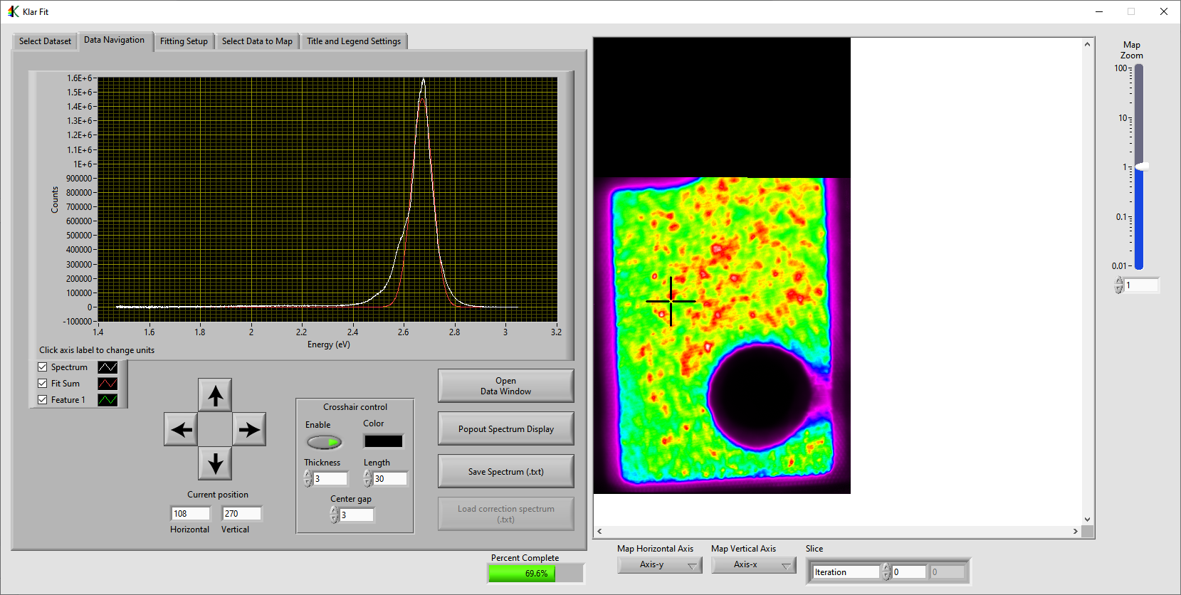 Klar Fit data analysis software is a powerful, versatile spectral peak-fitting and data presentation package. This software was specifically designed to handle the large datasets collected by our microscopes, where a map could consist of over a million spectra each composed of thousands of values.