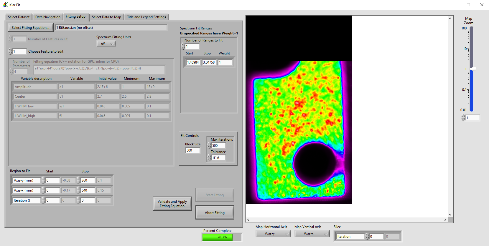 Klar Fit, the principal algorithm for analyzing a PL or Raman scan, enables extraction of the peak intensities, their spectral location, the width of the peaks, and other information, and creates customizable maps. Klar Fit uses GPU-accelerated peak fitting to a function selected by the user from an extensive library or to a custom fitting function created by the user. Fitting of millions of spectra, each with up to 2048 wavelength samples, can be accomplished in under an hour. Klar Fit has been used to analyze maps of a wide variety of materials and structures. It is easy to set up and provides a unique and powerful method for discovering essential properties of materials.